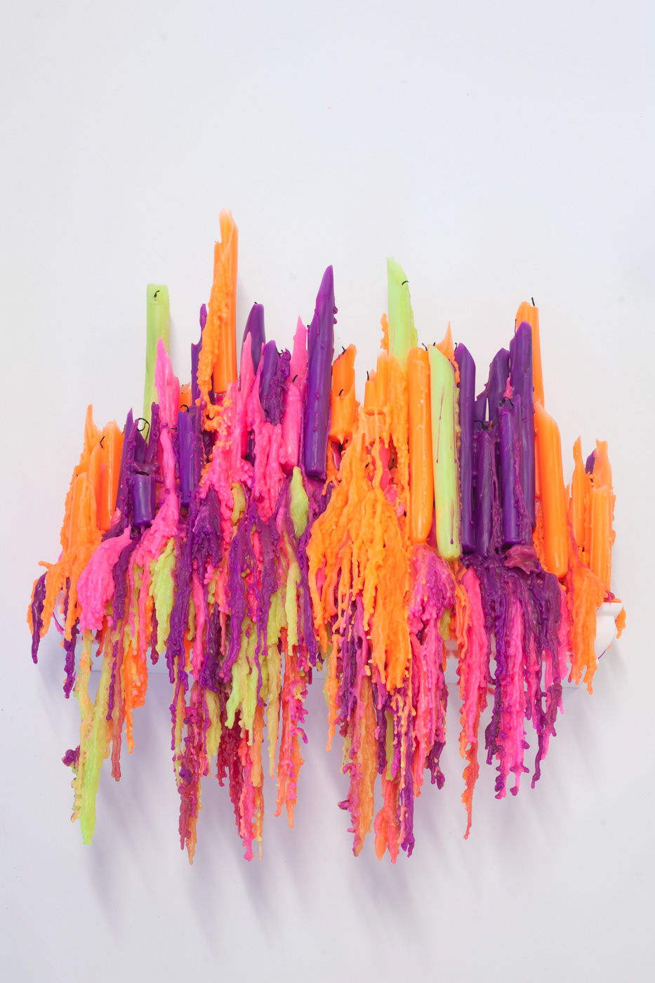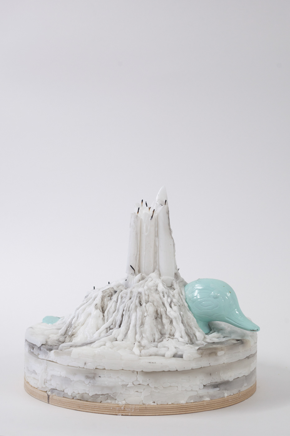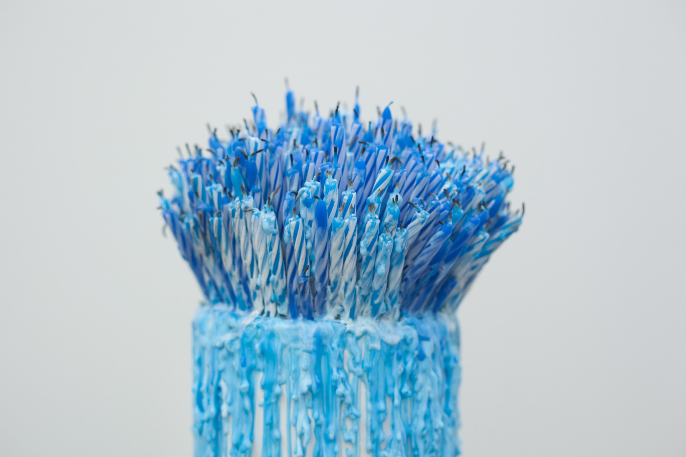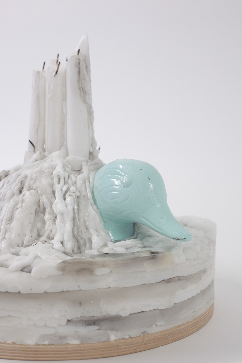 “Ruminations on Time” calls into question our relationship to time and draws attention to our reliance on productivity and activity to tell time. The sculptures in this part of the series are visual representations of the passing of time while performing time-wasting activities encouraged in online communities – scrolling through Instagram, wishing someone happy birthday on Facebook, and pinning things on Pinterest without ever doing anything with them. Candles mark the passing of time and reference votives, transmuting the resulting piles of wax into memorials of time lost.