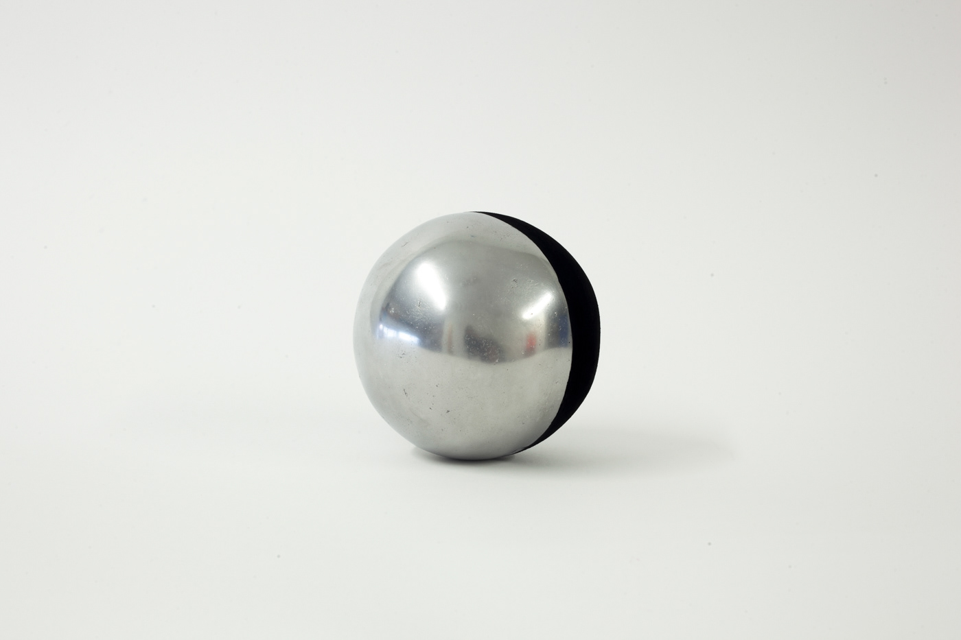 100 yards of aluminum foil crushed into a ball and shined. Half of the ball is then painted with Black 3.0 an acrylic paint created by Stuart Semple that absorbs 99% of all light, just shy of Vantablack. The result is a flat material physically shaped into a sphere only to be flattened again with pigment. Shaping aluminum foil into a ball using only a hammer was a Japanese internet trend that gained popularity in 2019.