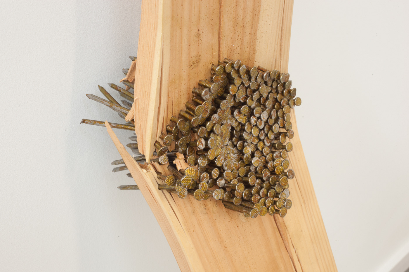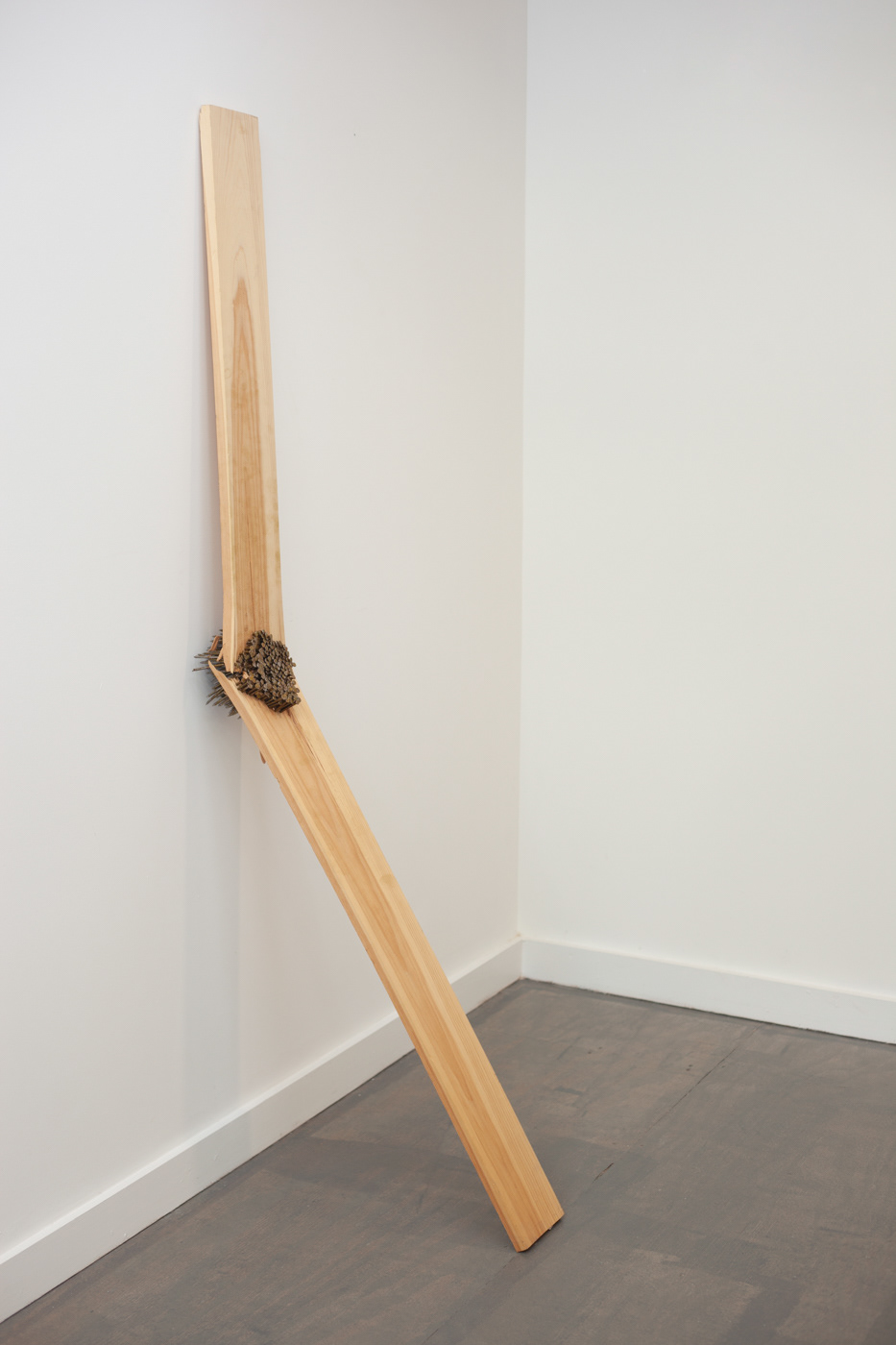 Sculptural documentation of a performance in which I repeat the action of nailing a board. The action references a seemingly productive and active form of work with no clear purpose.