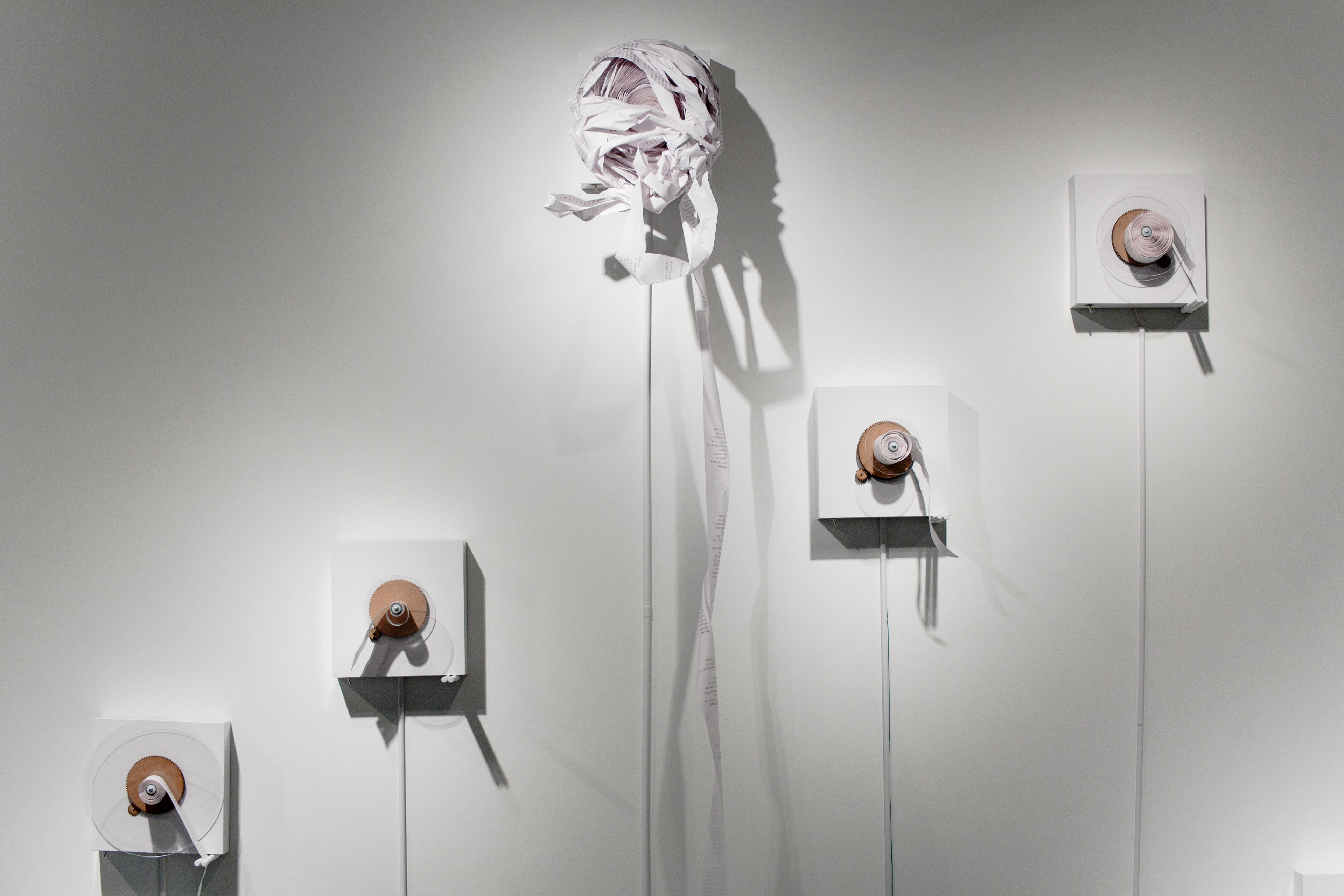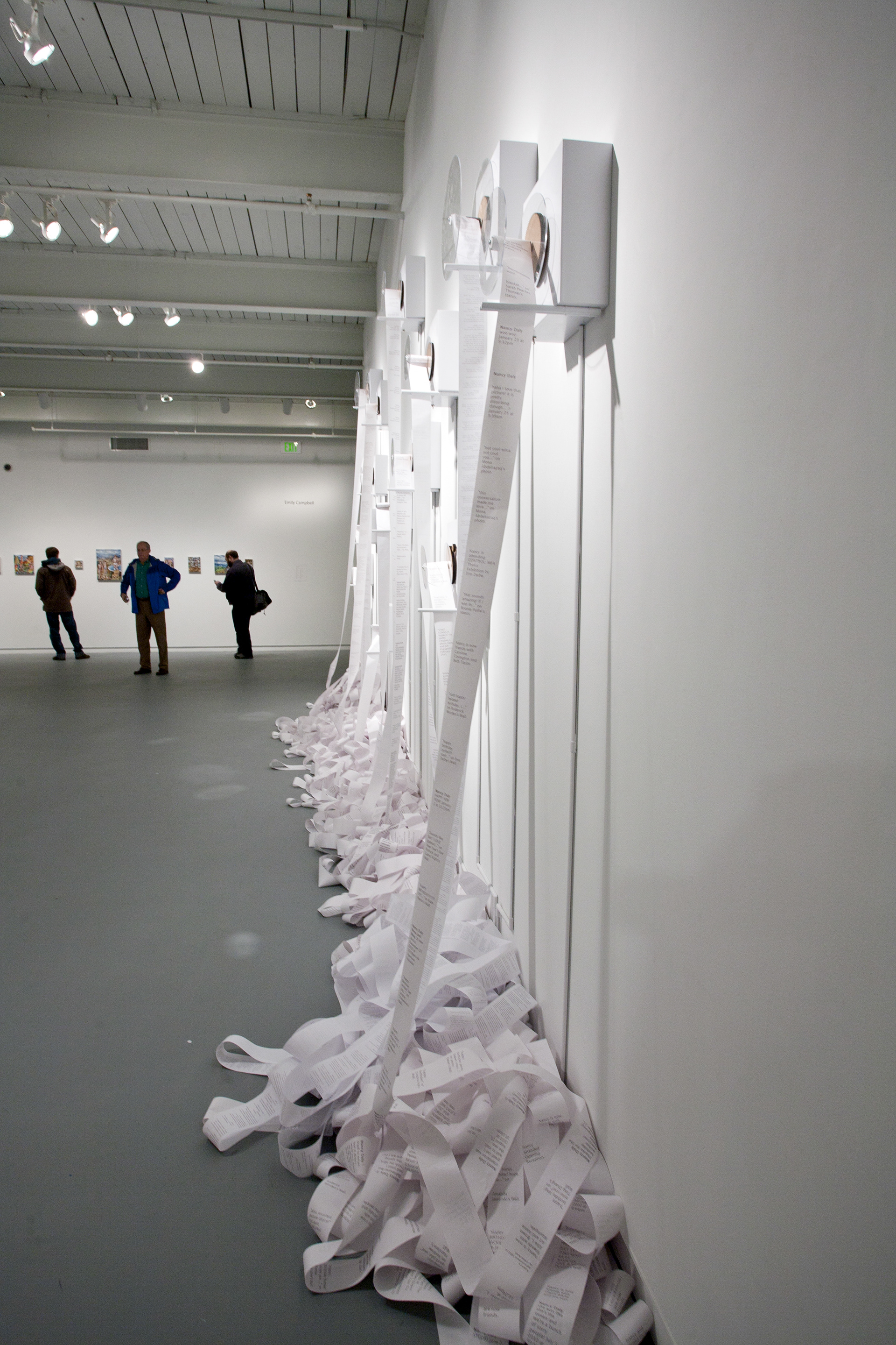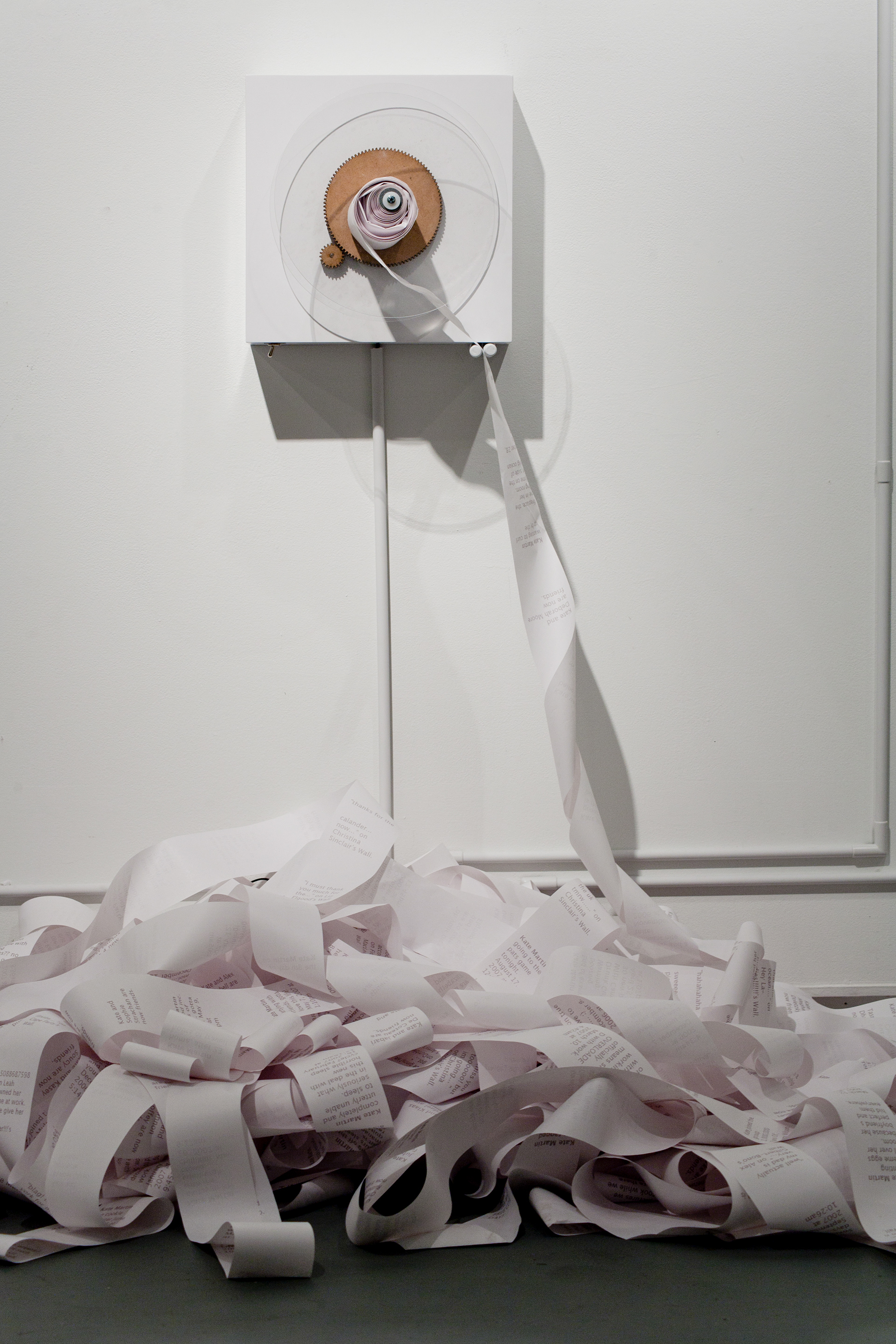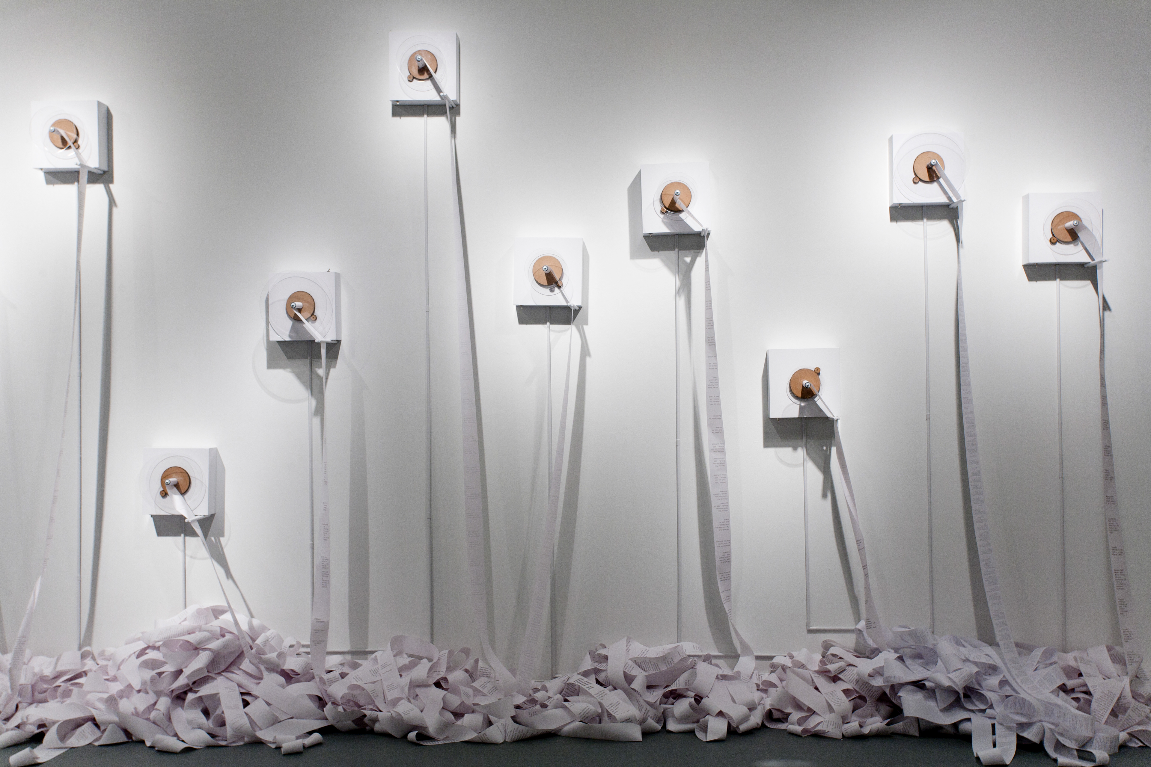 In the series Status Update, I am once again relegating a digital technology back to the material world, this time to explore what happens to an individual's online identity and memory of it at the moment he/she stops recording Facebook status updates. This time-based piece plays on the common assumption that various social media produce an unrelenting wave of information and challenges the viewer to consider what happens when the wave stops. Frequency becomes more important than content when establishing online relationships. At the same time, by recording everything, we are giving ourselves permission to forget or ignore. When the piece begins, a series of separate machines hang on the wall above piles of receipt paper on the floor. Each machine and corresponding roll represent all the Facebook status updates of one Facebook user from the day he or she signed up for the service to the day that he or she hypothetically stopped using the service.