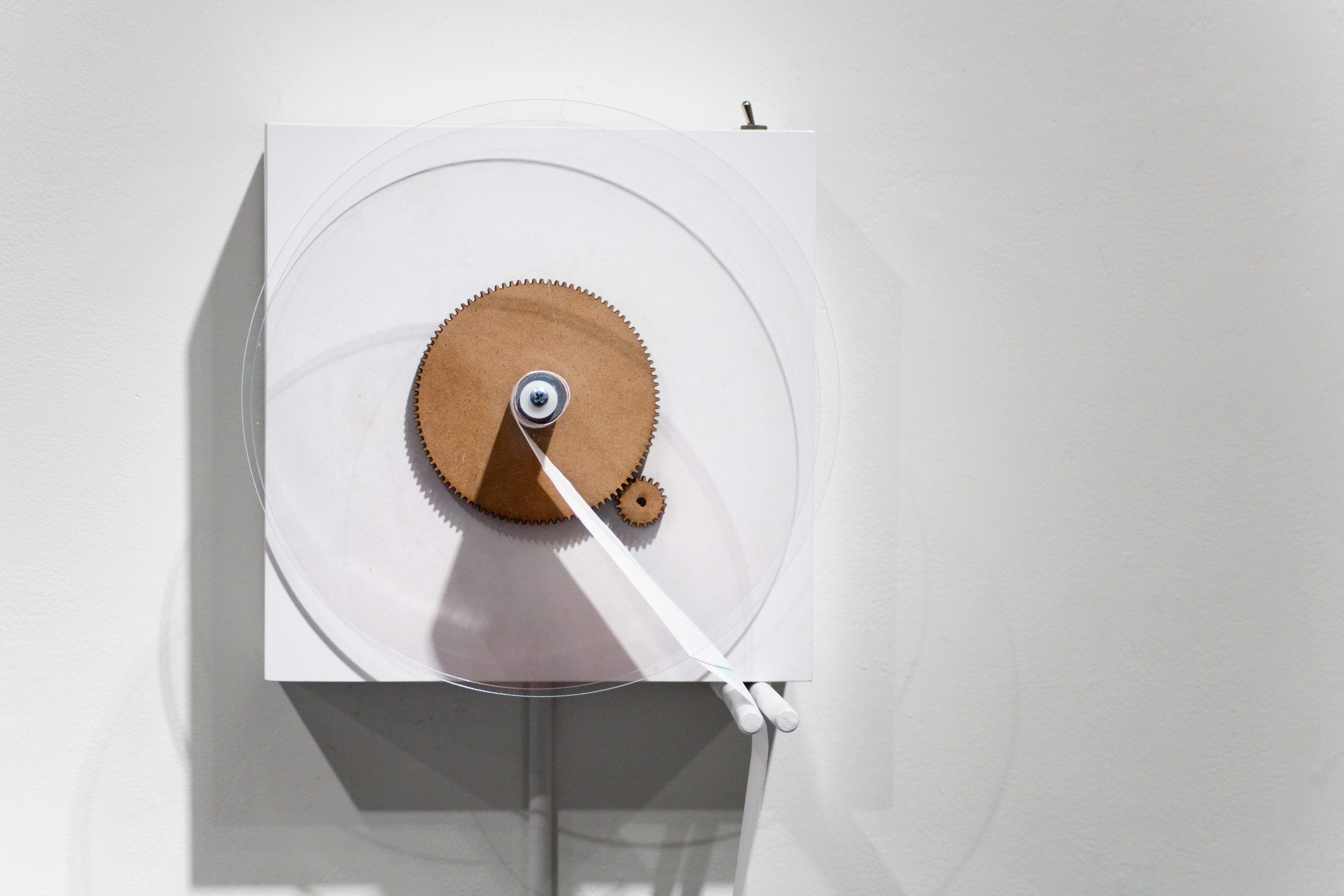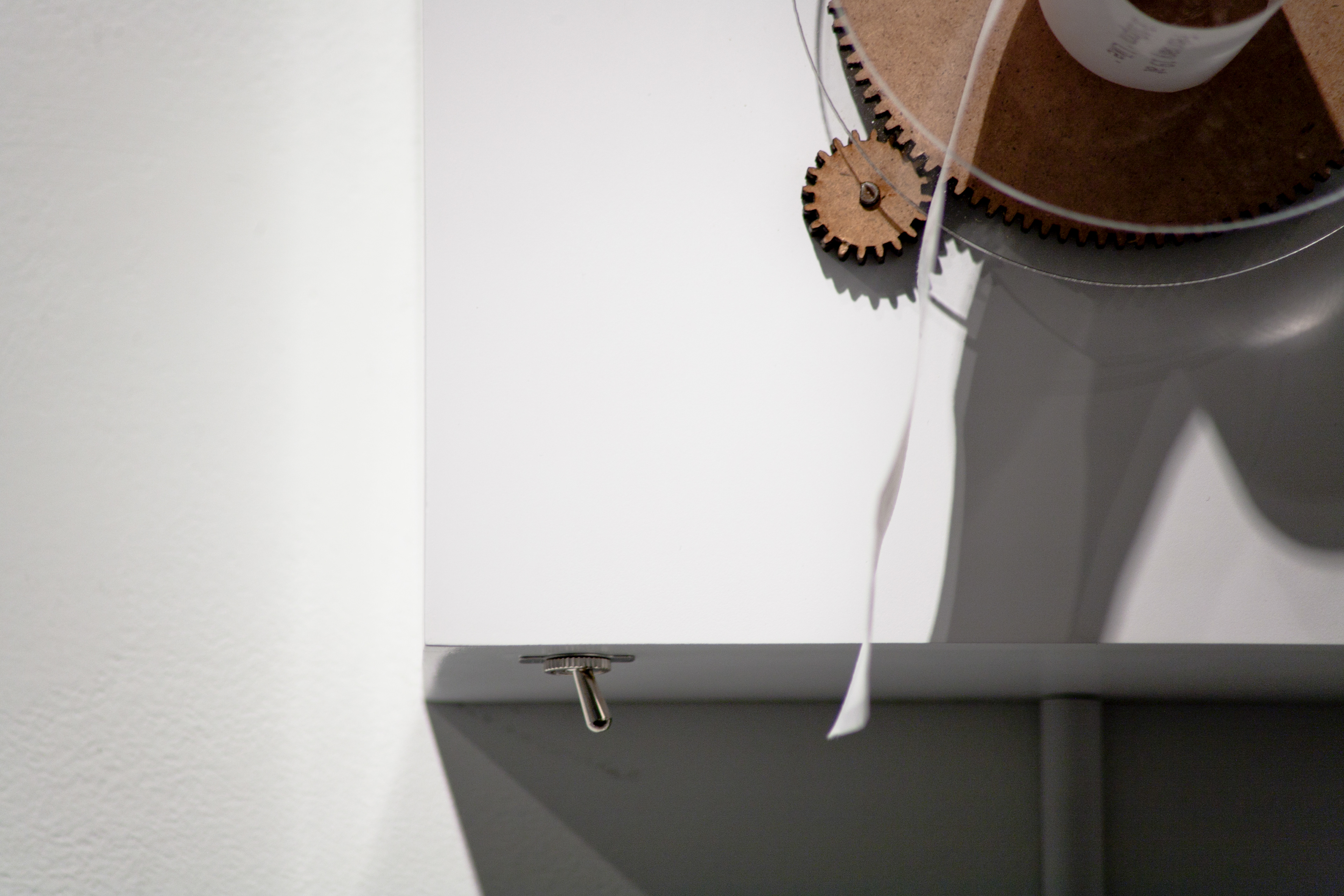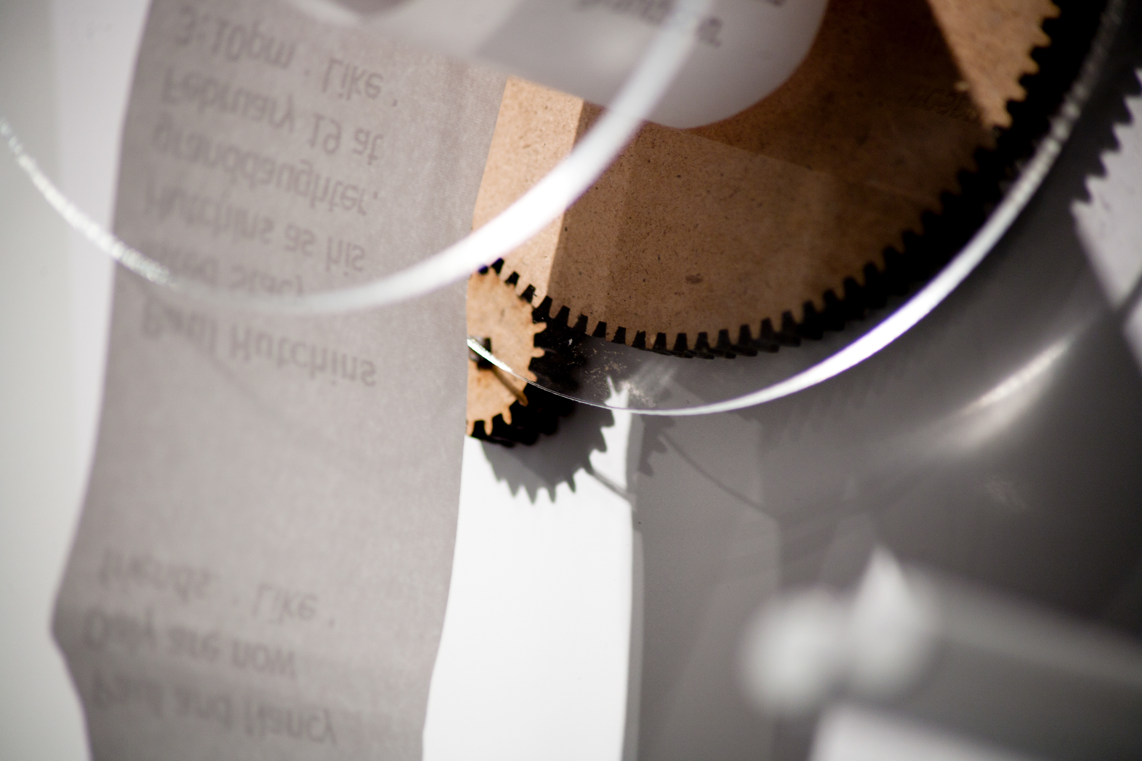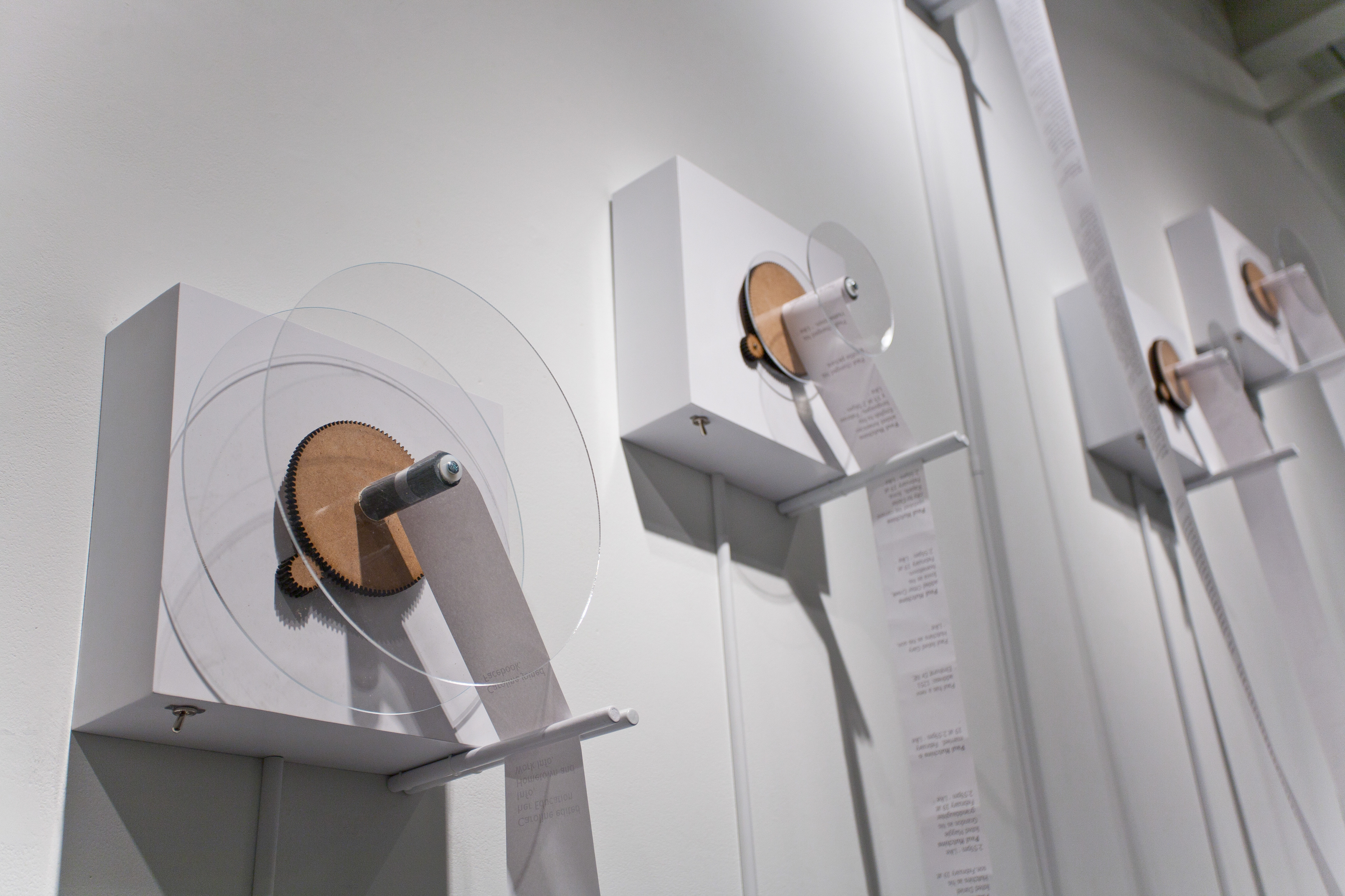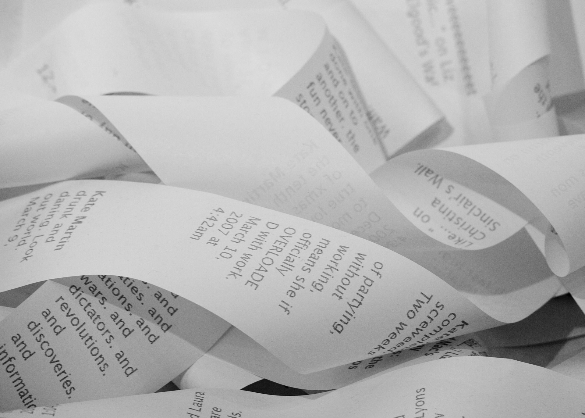 In the series Status Update, I am once again relegating a digital technology back to the material world, this time to explore what happens to an individual's online identity and memory of it at the moment he/she stops recording Facebook status updates. This time-based piece plays on the common assumption that various social media produce an unrelenting wave of information and challenges the viewer to consider what happens when the wave stops. Frequency becomes more important than content when establishing online relationships. At the same time, by recording everything, we are giving ourselves permission to forget or ignore. When the piece begins, a series of separate machines hang on the wall above piles of receipt paper on the floor. Each machine and corresponding roll represent all the Facebook status updates of one Facebook user from the day he or she signed up for the service to the day that he or she hypothetically stopped using the service.